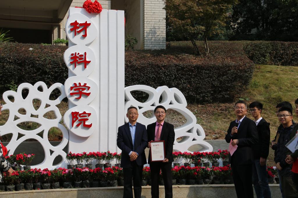 副校长罗锦银,浙江迅实科技有限公司总经理金良共同为6165cc金沙总站检测中心院名揭牌,副校长罗锦银为金总颁发了研究生企业家导师聘书。学院教职工在院名牌前合影留念。
