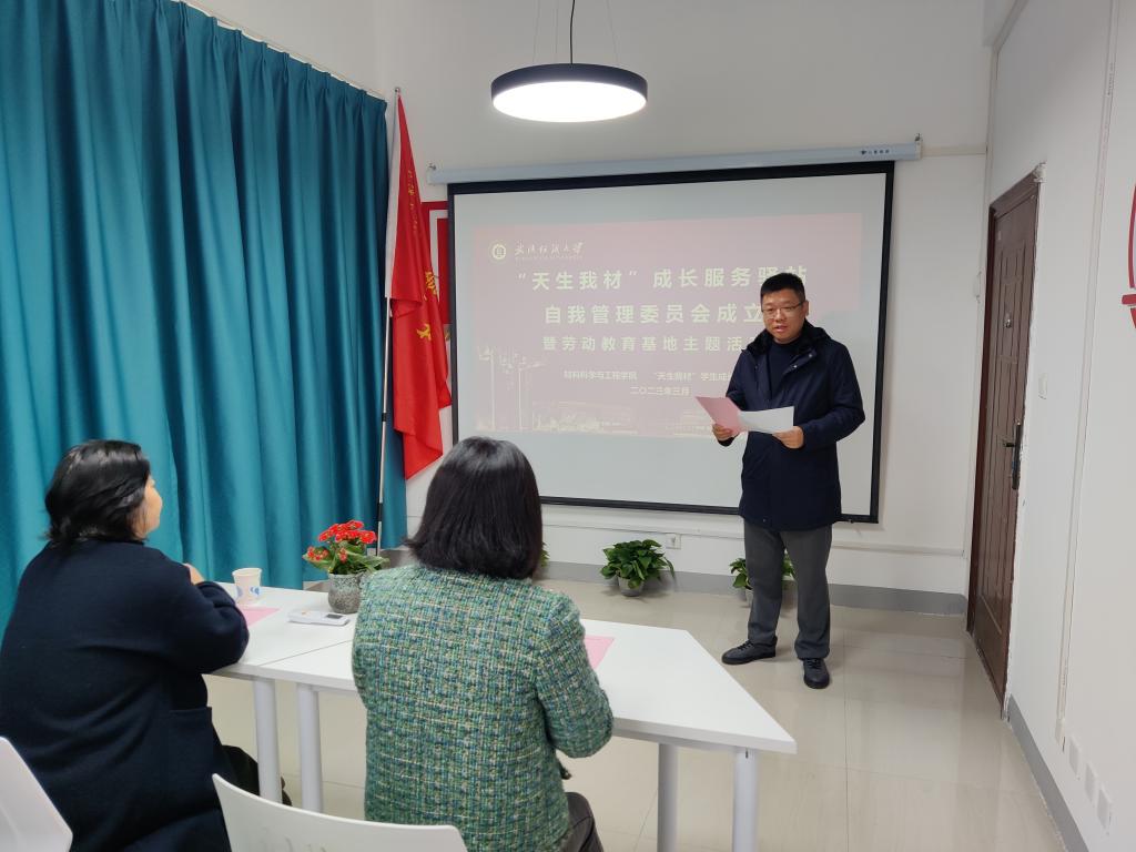 为深入贯彻学习习近平总书记关于教育的重要论述,进一步加强“一站式”学生社区综合管理模式建设,6165cc金沙总站检测中心紧紧围绕立德树人根本任务,秉承“以生为本、高效服务”的工作理念,积极建设“天生我材”学生成长服务站。2023年3月24日下午13、,6165cc金沙总站检测中心11栋学生成长服务驿站开展自我管理委员会成立仪式暨劳动教育基地主题活动。学生工作部部长张莎莎、6165cc金沙总站检测中心党委书记陈桂枝、6165cc金沙总站检测中心全体辅导员、学生代表参加活动,活动由6165cc金沙总站检测中心党委副书记魏剑主持。