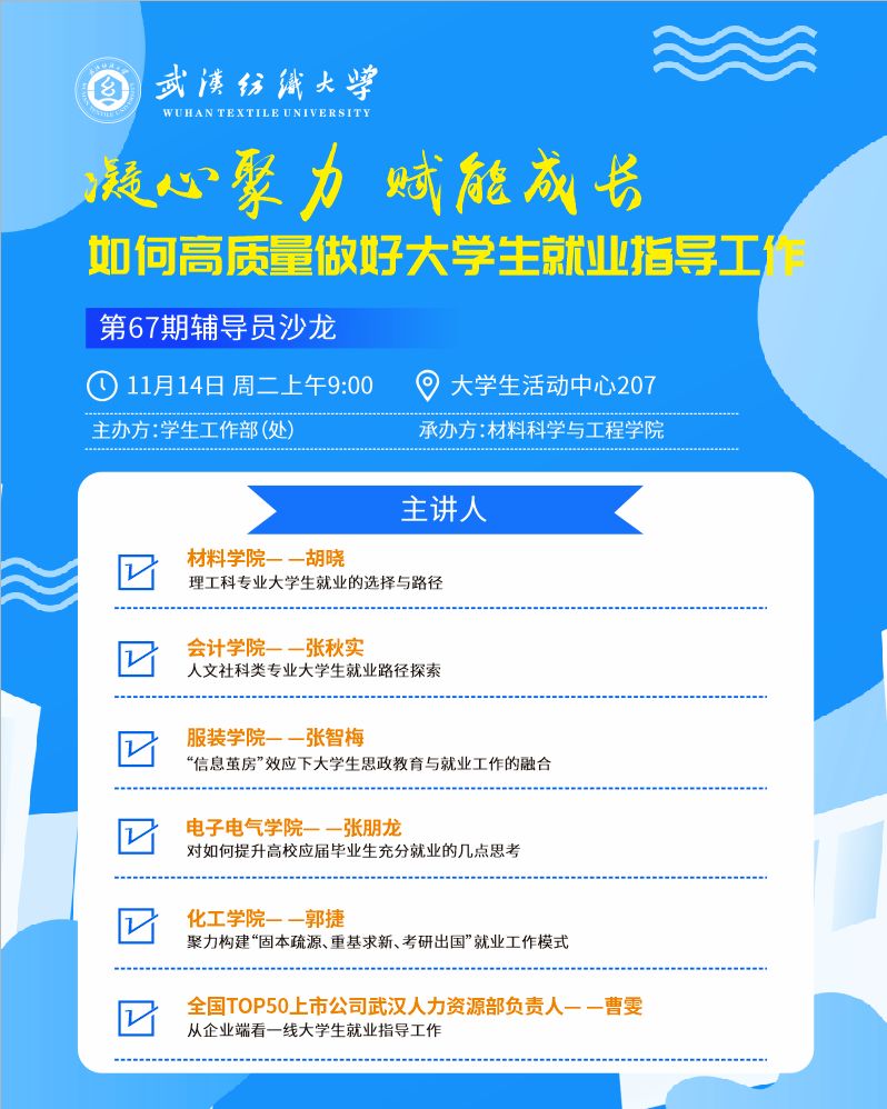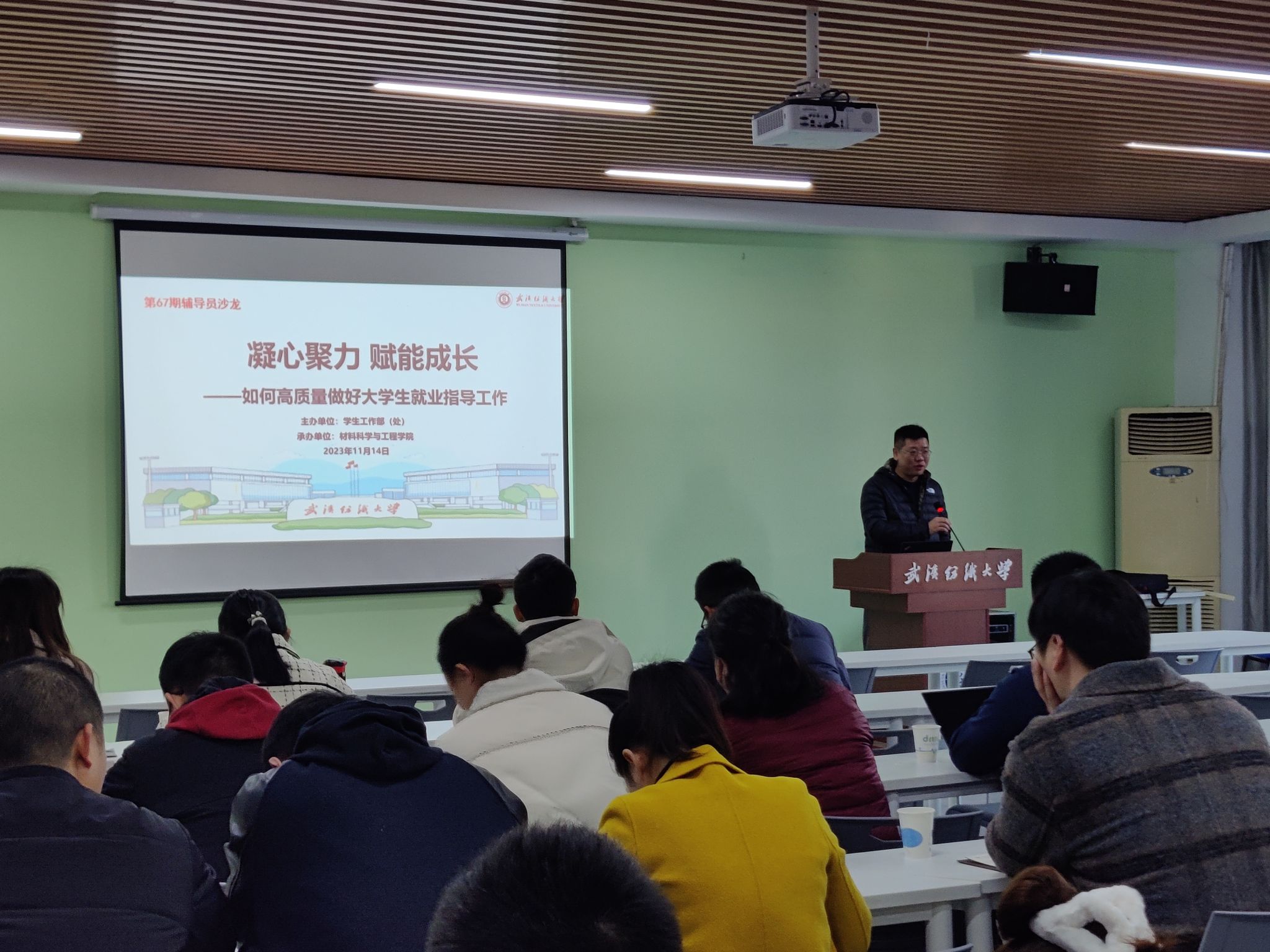为提升辅导员就业育人能力,促进毕业生更加充分更高质量就业,11月14日上午9时许,由学工部主办、6165cc金沙总站检测中心承办第67期辅导员主题沙龙在大学生活动中心207会议室顺利举行。学工部长张莎莎、部分学院党委副书记、辅导员代表参加。本次辅导员沙龙由6165cc金沙总站检测中心党委副书记魏剑主持。