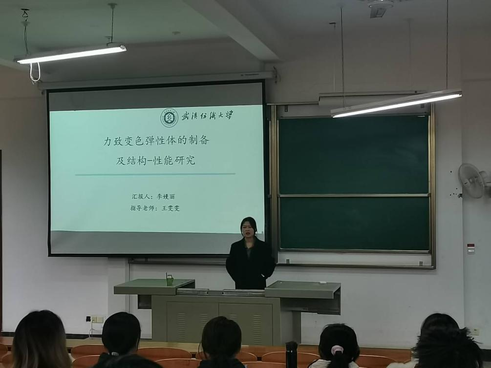 然后李嫚丽同学就力致变色弹性体的制备及结构-性能研究进行讨论,着智能材料的兴起,聚酯材料的结构功能化、功能多样化已成为重要的发展趋势。设计、开发能够对外界环境刺激产生响应性的智能聚酯弹性体材料对于创新产品理念,提升产品附加值具有显著的意义和价值。研究采用酯交换法合成含螺吡喃的线型聚酯弹性体。先以对苯二甲酸二甲酯、二醇和聚醚为原料制备出聚酯弹性体,在聚合后期加入含变色基团的共聚单体,反应一定时间后,出料。从高分子链段结构设计角度,将功能性基团嵌入高分子链实现功能化,改善了材料的使用寿命并提高产品附加值。