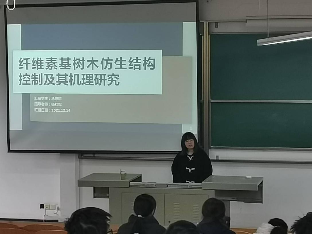 首先马思甜同学以纤维素展开讲解,树木作为纤维的主要来源,在结构方面表现出特有的通孔结构,具有比表面积大,应用广泛等优点,如果能够实现将现有的纤维素做成与树木相同的结构,必然可以扩大纤维素的应用领域,提高纤维素制品的性能,指出通过仿生结构以纤维素作为原材料,制备成树木结构中的通孔结构,是十分重要的研究方向。指出通过冰模板法制出的仿生结构具有良好的性能,有很高的应用价值。