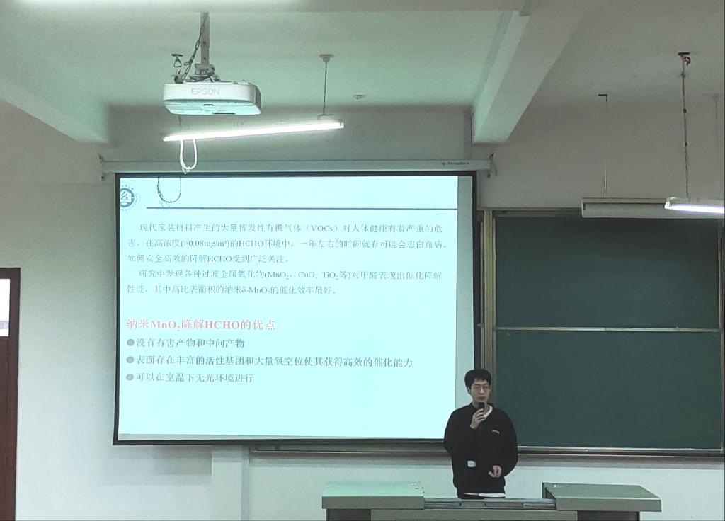最后,段子建同学以织物负载型δ-MnO2催化剂对甲醛降解的催化效率最好,但其却由于与织物间纯物理作用而不耐洗涤为切入点,介绍了基于表面原位羟基与羧基协同作用的耐洗涤MnO2@PMIA纤维的制备过程;并基于研究结果展示了该纤维对甲醛的高催化活性,在一定程度上为纤维型MnO2甲醛催化剂的实际应用提供了依据。