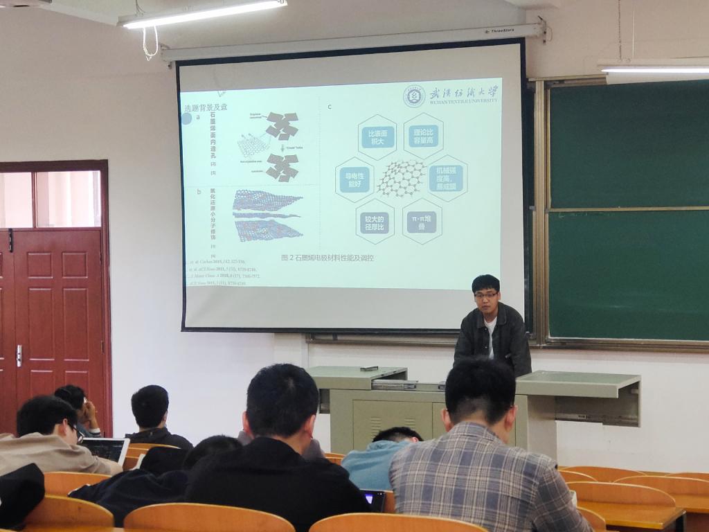 随后,郭超同学介绍了对苯二胺功能化石墨烯研究及其在超级电容器中应用目前的研究现状:制造技术飞速发展,可穿戴电子产品、健康监测传感器等便携式电子设备正向柔性化、轻质化、微型化及智能化方向发展,超级电容器作为电子产品提供能量的储能器件也逐步向轻、薄、韧进军。开发能够弯曲、折叠、扭曲、拉伸等协调变形的新一代高性能柔性储能器件十分必要。并详细地介绍了自己的研究进程,并谈到了一般制备方法以及实验部分如何制备和表征结果的讨论。
