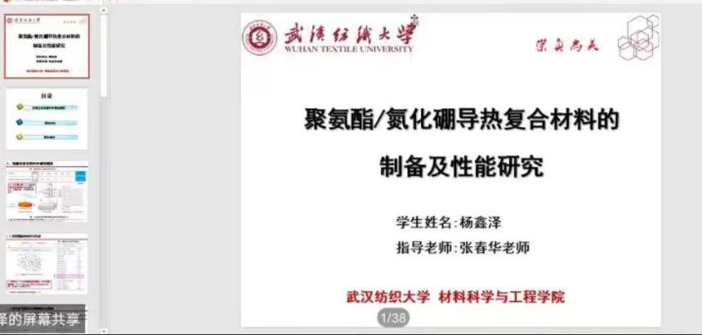 随后,杨鑫泽同学介绍了其制备的导热复合材料是选用聚氨酯作为基体材料,与具有优异导热性能、良好化学稳定性的无机陶瓷材料——六方氮化硼作为填料结合而成的。而后,他通过对该改性复合材料进行热稳定性等性质的全面探究得出了改性h-BN/PU复合膜具有良好的热稳定性、导热稳定性,同时弹性模量也在一定程度上得到了提升。