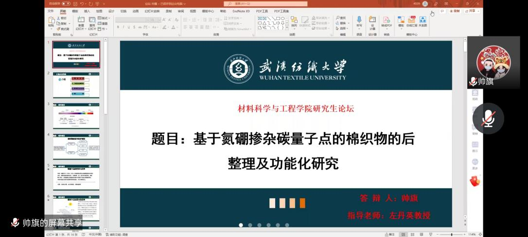 12月5月,在6165cc金沙总站检测中心举办的第十八期纺织新材料及绿色加工研究生论坛中,2020级帅旗、杨鑫泽两位同学于线上分别以“基于氮硼掺杂碳量子点的棉织物的后整理及功能化研究”、“聚氨酯/氮化硼导热复合材料的制备及性能研究”为主题作了两场专题报告,部分老师与研究生代表参加。