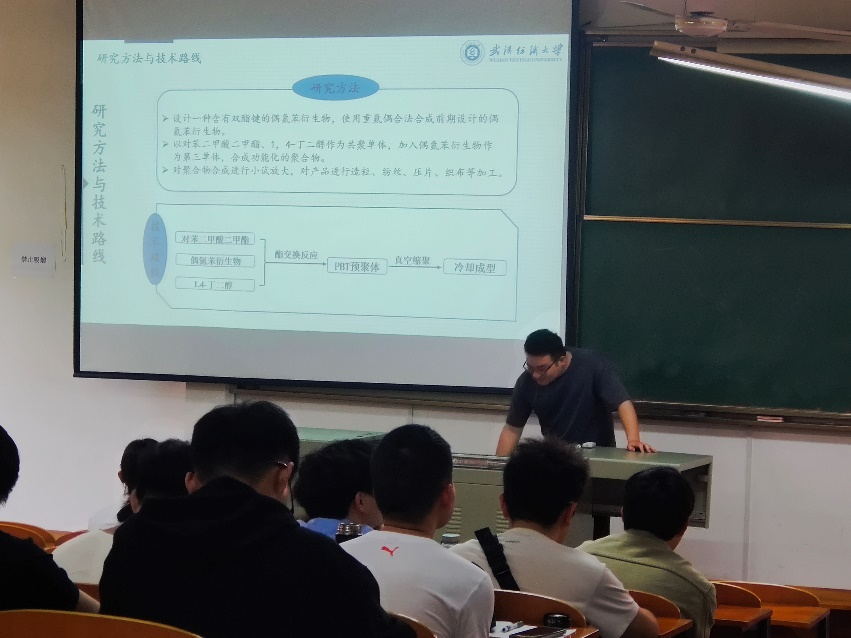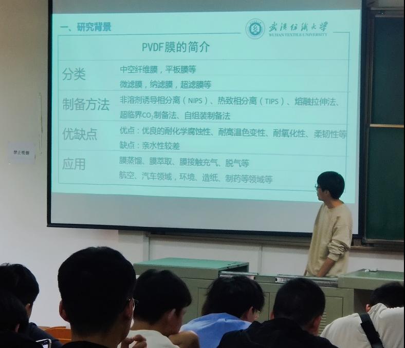 为进一步加强校内的学术交流。6165cc金沙总站检测中心4月12日举行了研究生论坛。本次论坛由邀请李秀芳、朱雨璇两位老师参加,研究生张吉聪、石凯、徐浪为全体学生和老师以题为“基于偶氮苯衍生物的光致变色聚酯及纤维的制备及性能研究”、“壳聚糖生物粘合剂的制备及其性能研究”以及“液膜表面喷涂聚偏二醇溶液对聚偏二乙烯膜结构及防污性能的影响”的进行论坛报告。