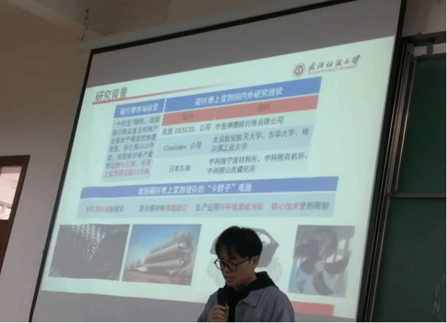 首先,张磊昂介绍了他的研究成果,题为“光固化上浆剂的制备及对碳纤维处理改性的研究”。研究主要集中在一种创新的上浆剂,通过光固化技术进行制备,这项技术在纳米科技和材料科学中取得了显著的进展,而在碳纤维处理改性中的应用更是一项引人注目的研究领域,同时他表示这种上浆剂通过光固化过程中形成的网络结构,能够显著增强碳纤维的表面硬度和化学稳定性,从而提高了其耐久性和力学性能。