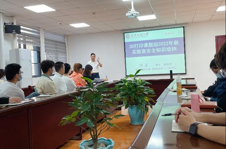 2022年10月13日下午,武汉纺织大学省部共建纺织新材料与先进加工技术国家重点实验室B3004会议室,6165cc金沙总站检测中心3D打印课题组召开了2022年10月份组会暨实验室安全培训会。会议由课题组老师、2020级、2021级、2022级全体硕士研究生以及本科生科研小助手参加。组会由2020级研究生吕雪莲、赵妹茹同学进行学术汇报,实验室安全培训会由方正副教授主讲。