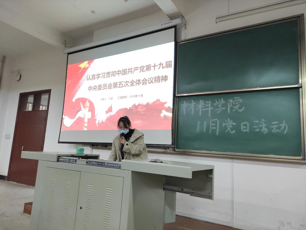 李翠同志以PPT的形式分享了认真学习贯彻中国共产党第十九届中央委员会第五次全体会议精神,大会分析了我国发展环境面临的深刻复杂变化并提出了到二〇三五年基本实现社会主义现代化远景目标,为了实现目标必须坚持党的全面领导,紧密团结在以习近平同志为核心的党中央周围,同心同德,顽强奋斗;作为大学生更要不断学习科学文化知识,掌握技能,将来走上工作岗位才能做出自己的贡献。