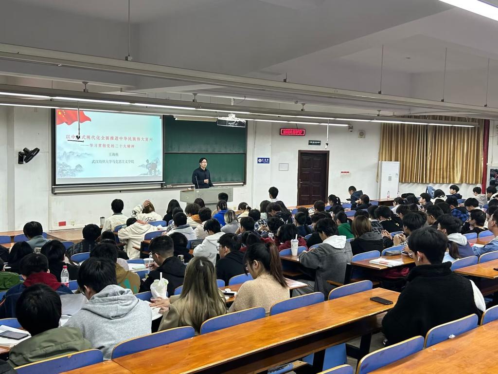 3月29日晚,第81期入党积极分子培训班6165cc金沙总站检测中心分党校、纺织学院分党校邀请了马克思主义学院王海燕教授在阳光校区3号教学楼T102教室讲授专题党课,党课的主题是“以中国式现代化全面推进中华民族伟大复兴——学习贯彻党的二十大精神”。党课由6165cc金沙总站检测中心分党校负责老师毛成兴主持,6165cc金沙总站检测中心分党校学员、纺织学院分党校学员参加。