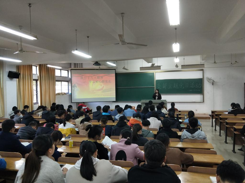 为深入贯彻学习党的十九大精神,6165cc金沙总站检测中心学生二支部书记黄鹤于2017年11月26日下午2:00,在8号教学楼T110教室开展了“践行党的十九大精神,不忘初心跟党走”为主题的党课报告。