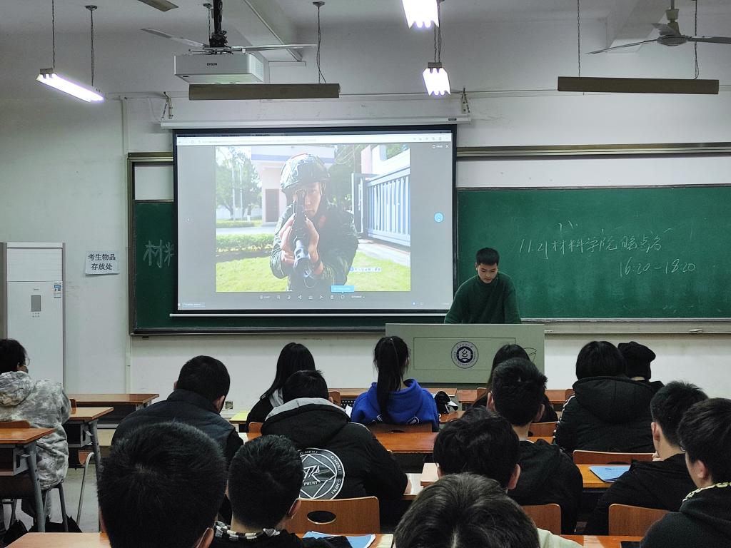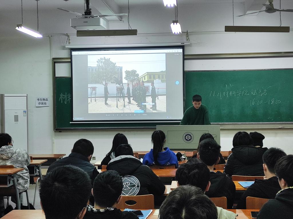 而在各班级的“携笔从戎 青春报国”主题班会上,同学们纷纷响应,积极了解入伍政策畅谈想法。材科12002班的刘超,参加了9月份的役前训练,感触颇深,为同学们分享了自己的训练感受。