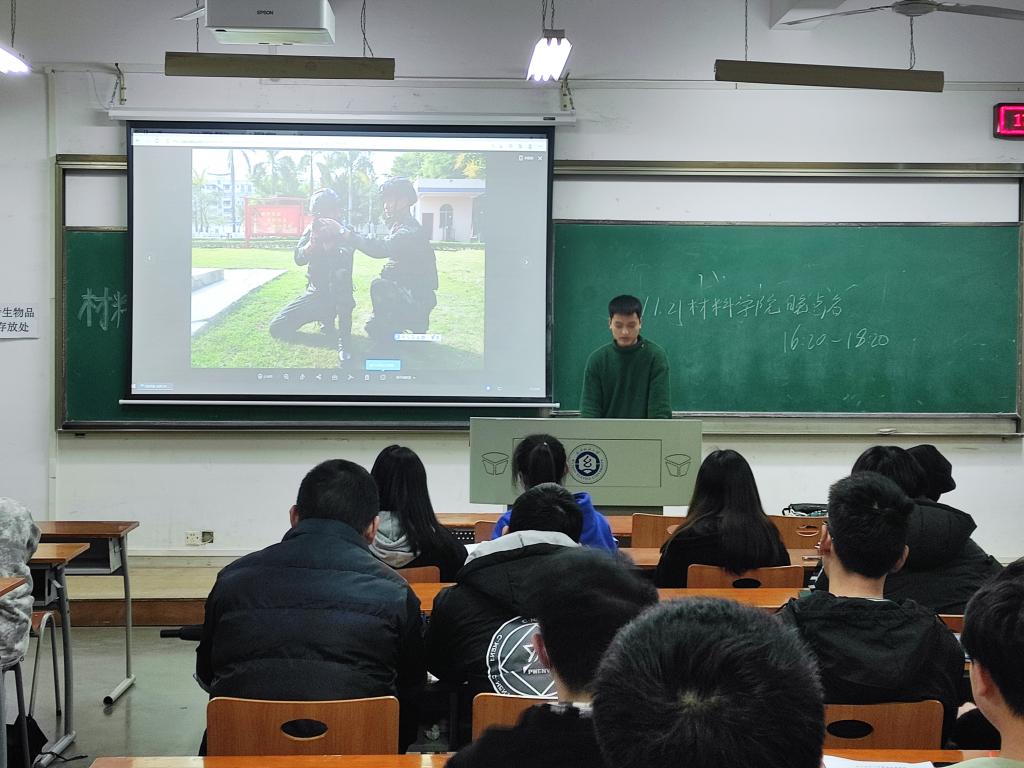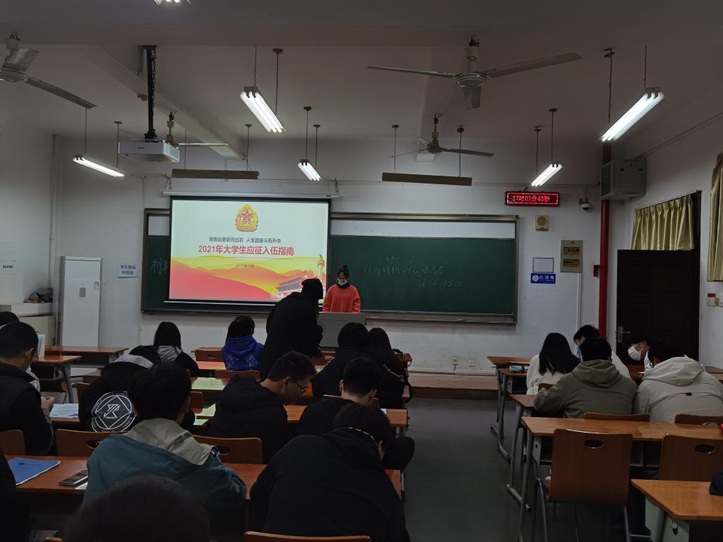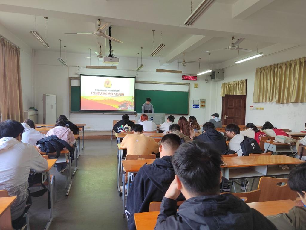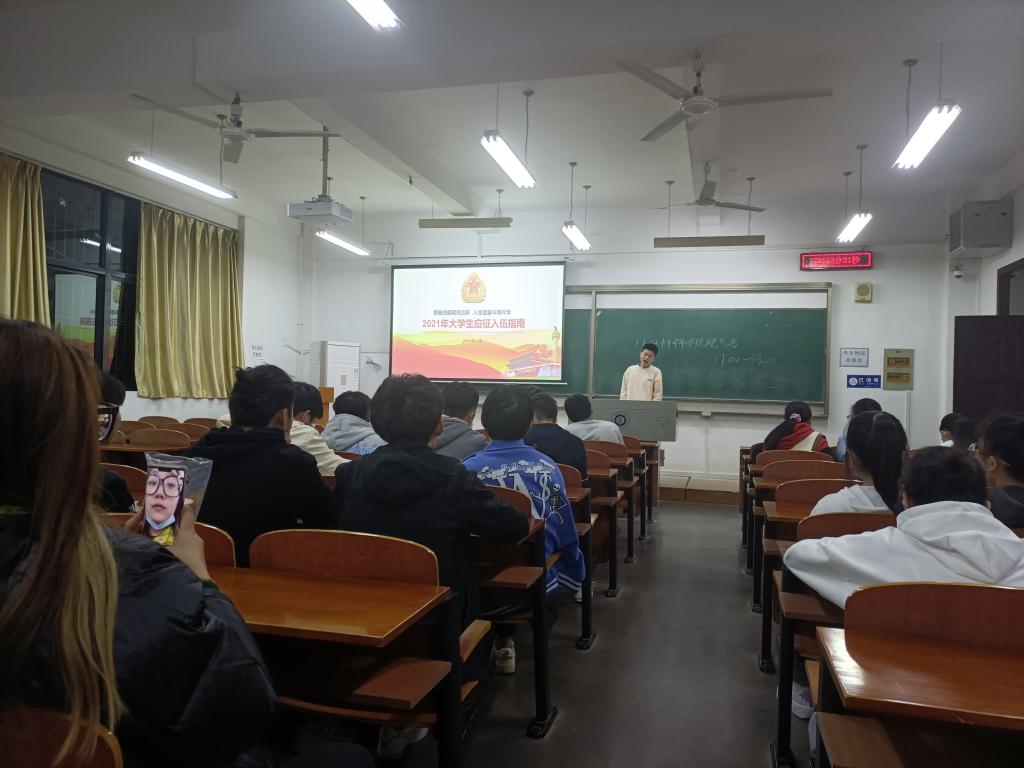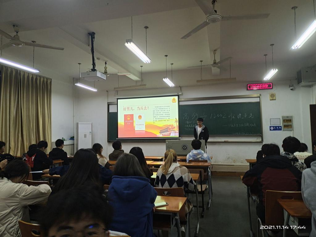 11月23日,胡老师在毕业年级政策宣讲过程中,为毕业生算了三笔账:一是“政治账”,大学生参军优待;二是“发展账”,毕业生参军入伍发展前景更广;三是“经济账”,国家为参军大学生补偿学费,减轻家庭负担。随后,从部队简介、入伍基本条件、入伍流程、大学生参军特别优惠政策和军营生活等方面做了简要阐述,鼓励同学们参军入伍,实现人生价值。